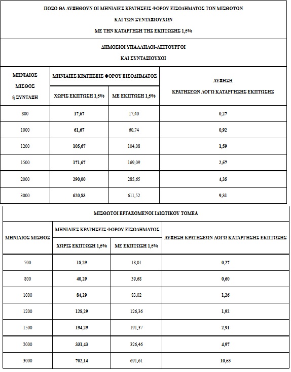 - Έστω ένας μισθωτός που έχει τον μήνα εισόδημα 1.643 ευρώ, δηλαδή σε ετήσια βάση το ποσό που λαμβάνει ανέρχεται σε 23.000 ευρώ. Ο συγκεκριμένος μισθωτός θα διαπιστώσει απώλειες της τάξης των 51 ευρώ τον χρόνο. Αν ο ίδιος φορολογούμενος είχε μισθό της τάξης των 2.000 ευρώ, τότε η ετήσια πρόσθετη επιβάρυνση θα ανέλθει στα 74 ευρώ. Αισθητές διαφορές και μεγαλύτερες επιβαρύνσεις προκύπτουν για μηνιαίους μισθούς άνω των 2.500 – 3.000 ευρώ λόγω του ότι σε αυτές τις περιπτώσεις αυξάνονται σημαντικά και οι φορολογικοί συντελεστές.