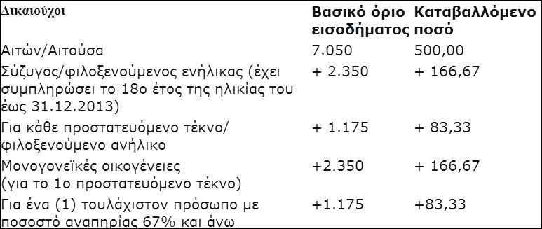 Σημειώνεται, ότι το βασικό όριο προσαυξάνεται κατά 1/3 για τους έγγαμους και κατά 1/6 για κάθε προστατευόμενο τέκνο ή φιλοξενούμενο ανήλικο. Προκειμένου για μονογονεϊκές οικογένειες, η οικογενειακή κλίμακα ισοδυναμίας ορίζεται για το πρώτο προστατευόμενο τέκνο σε 1/3. Ενώ, στην περίπτωση δικαιούχου/οικογένειας με ένα τουλάχιστον πρόσωπο με ποσοστό αναπηρίας 67% και άνω, η αντίστοιχη με την κατηγορία τους οικογενειακή κλίμακα ισοδυναμίας προσαυξάνεται κατά 1/6.