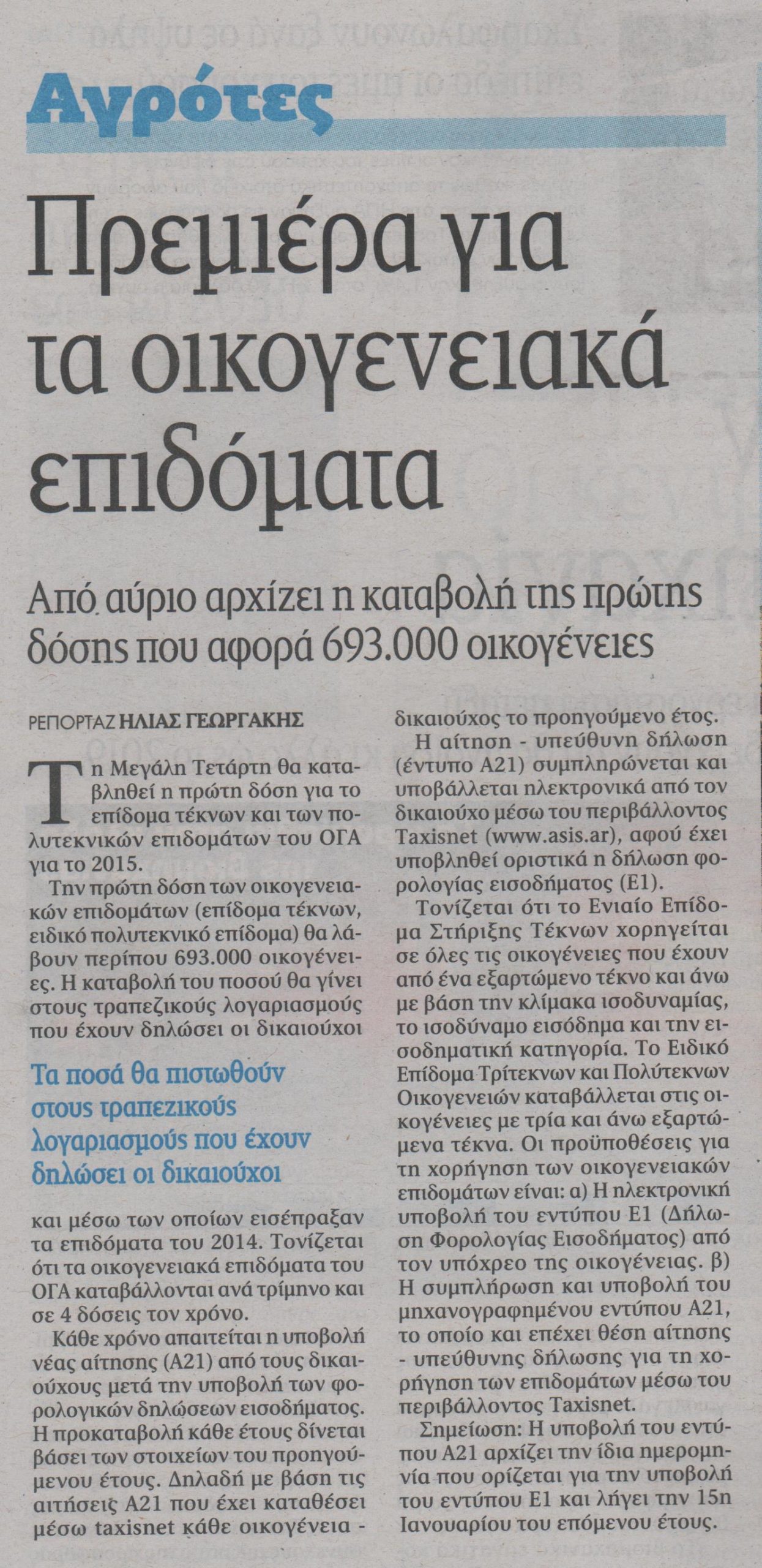 Τη Μεγάλη Τετάρτη θα καταβληθεί η πρώτη δόση για το επίδομα τέκνων και των πολυτεκνικών επιδομάτων του ΟΓΑ για το 2015.