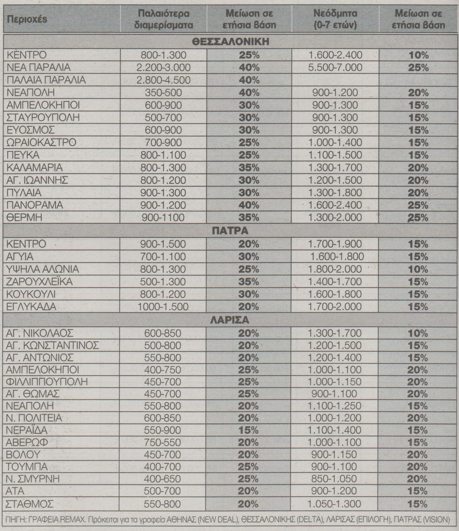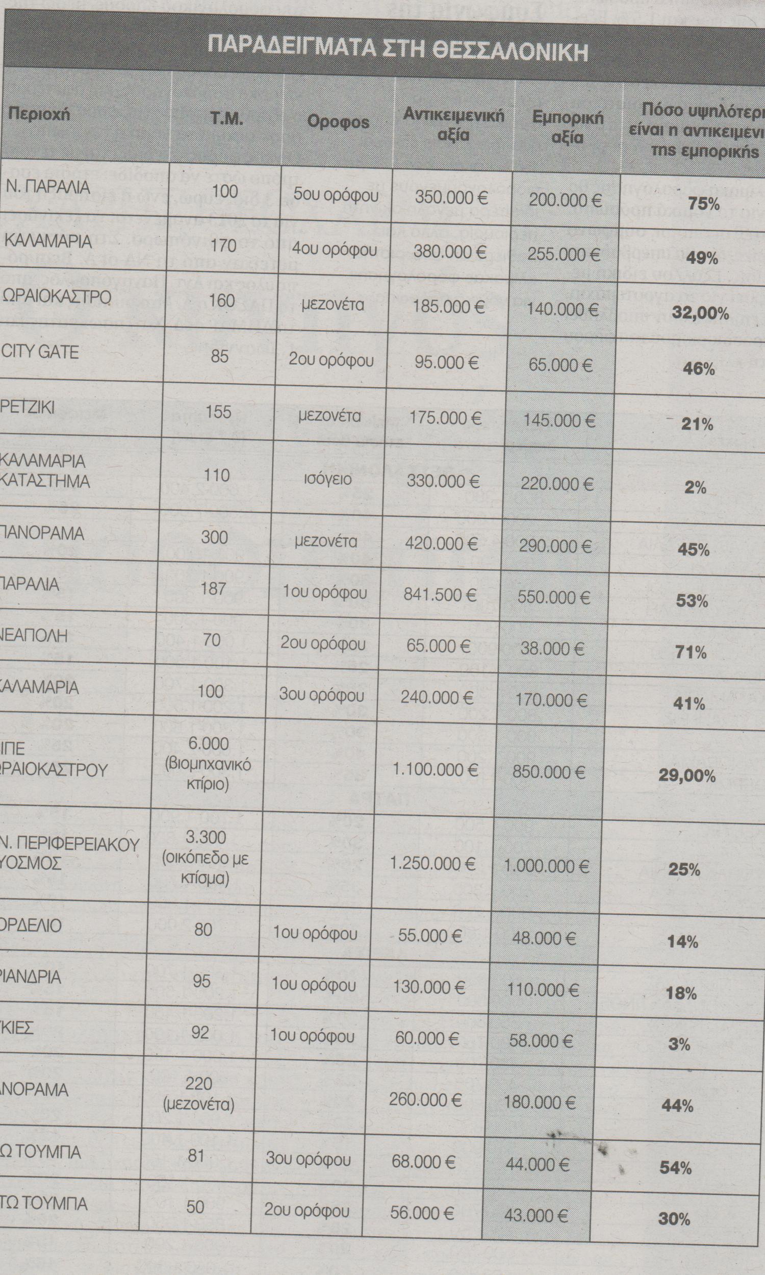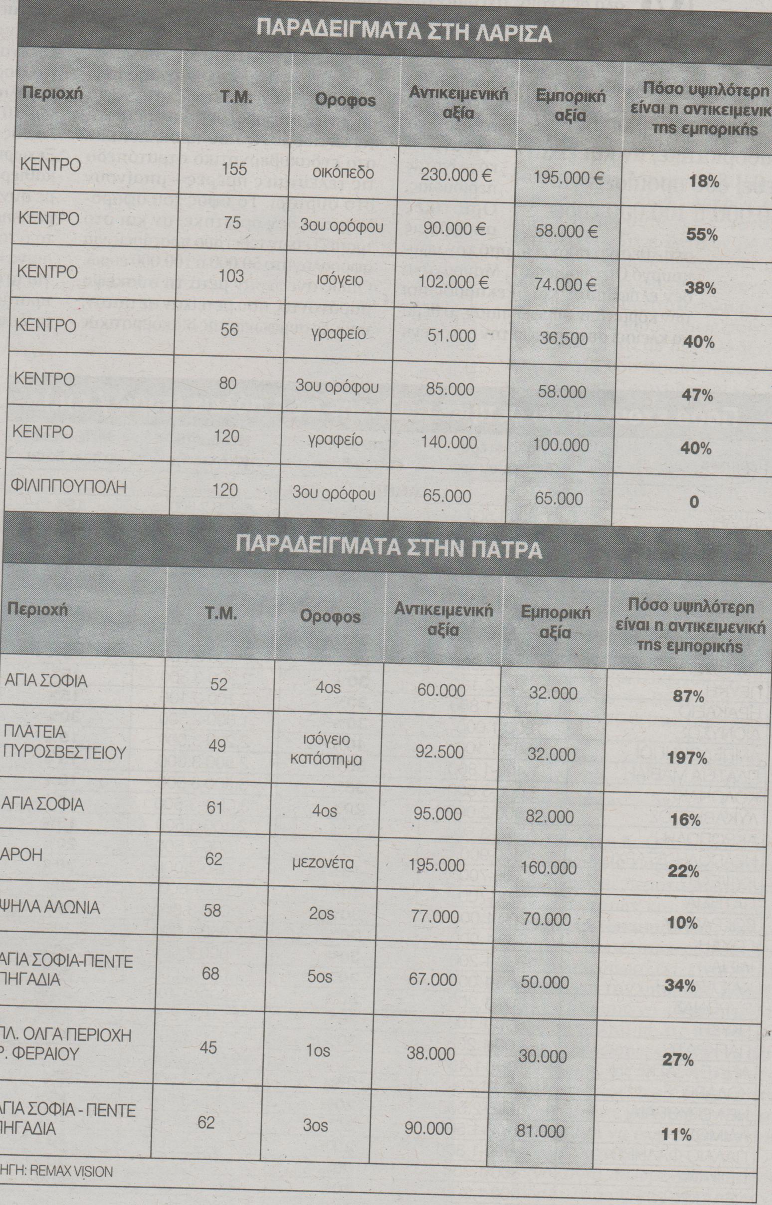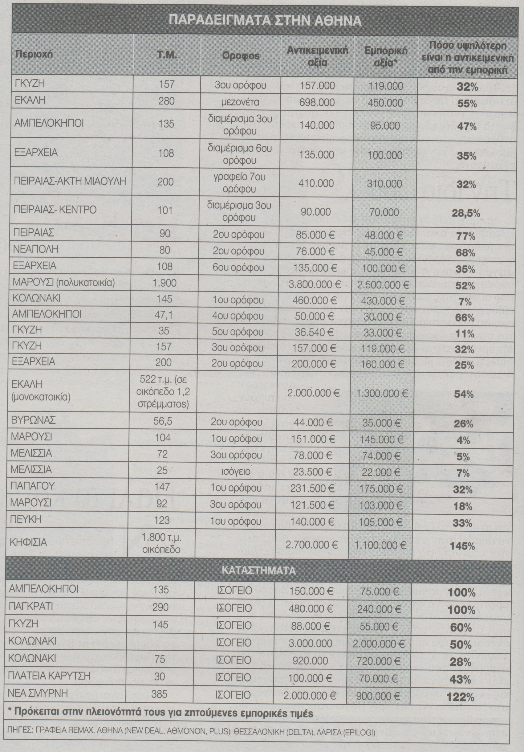Την ίδια στιγμή σε πάρα πολλές περιοχές της χώρας οι αντικειμενικές τιμές έχουν φτάσει να είναι ακόμη και υπερδιπλάσιες των εμπορικών τιμών. Το γεγονός αυτό δημιουργεί την ανάγκη για μειώσεις των αντικειμενικών τιμών στην επικείμενη αναπροσαρμογή τους όπως προβλέπει και το Μνημόνιο.