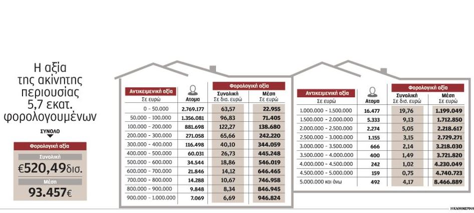 Όπως όλα δείχνουν το 2016 περισσότεροι από 6,1 εκατ. ιδιοκτήτες ακινήτων θα πληρώσουν έναν νέο φόρο ακινήτων τα έσοδα του οποίου θα ανέρχονται στο ποσό των 2,65 δισ. ευρώ, δηλαδή όσα ακριβώς έχουν εγγραφεί και στο μνημόνιο. Ανώτατο στέλεχος του υπουργείου Οικονομικών αναφέρει ότι όλες οι αλλαγές εκτός από το ότι θα πρέπει να δίνουν αποτέλεσμα για τα δημόσια έσοδα 2,65 δισ. ευρώ, θα πρέπει να είναι σε συνάρτηση και με τις νέες αντικειμενικές αξίες που θα αναπροσαρμοστούν τον Σεπτέμβριο του 2016. Ειδικότερα το σχέδιο που επεξεργάζεται το οικονομικό επιτελείο της κυβέρνησης και το οποίο θα πρέπει να εγκριθεί από τους δανειστές της χώρας προβλέπει τα εξής: