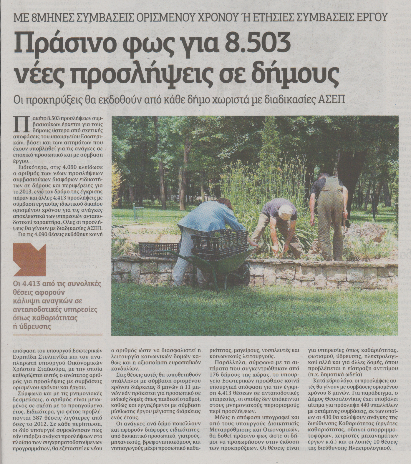 Ειδικότερα, στις 4.090 κλείδωσε ο αριθμός των νέων προσλήψεων συμβασιούχων διάφορων ειδικοτήτων σε δήμους και περιφέρειες για το 2013, ενώ τον δρόμο της έγκρισης πήραν κι άλλες 4.413 προσλήψεις με σύμβαση εργασίας ιδιωτικού διακαίου ορισμένου χρόνου για τις ανάγκες αποκλειστικά των υπηρεσιών ανταποδοτικού χαρακτήρα. Όλες οι προσλήψεις θα γίνουν με διαδικασίες ΑΣΕΠ.