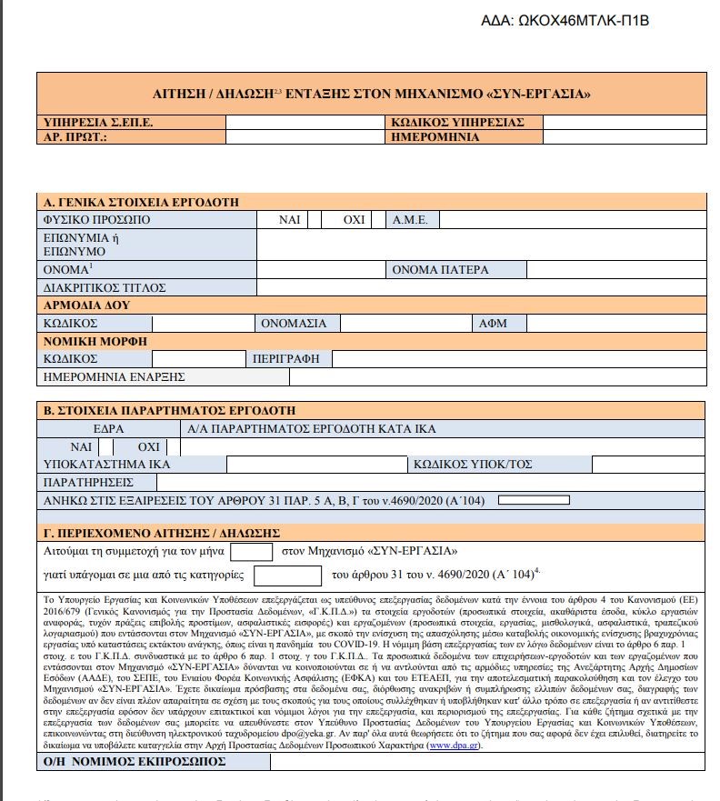Επισημαίνεται πως οι ανωτέρω επιχειρήσεις-εργοδότες που θα ενταχθούν στο πρόγραμμα “ΣΥΝ-ΕΡΓΑΣΙΑ”, καλούνται ανά μήνα, εκκινώντας από σήμερα 15 Ιουνίου 2020, να προαναγγείλουν το διάστημα για το μήνα για τον οποίο θα κάνουν χρήση της ρύθμισης του άρθρου 31 του ν. 4690/2020 (Α’ 104), καθώς και την κατηγορία στην οποία υπάγεται η επιχείρηση, βάσει του συγκεκριμένου άρθρου, στο ειδικό έντυπο «Αίτηση/Υπεύθυνη Δήλωση Ένταξης στο Μηχανισμό “ΣΥΝ-ΕΡΓΑΣΙΑ”». Επίσης, δηλώνουν στο ίδιο έντυπο, κατά την Α’ φάση υποβολής: