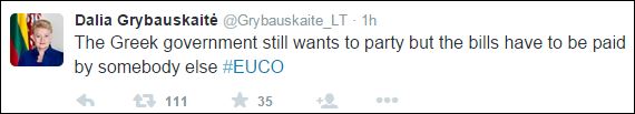 “Η ελληνική κυβέρνηση εξακολουθεί να θέλει να κάνει πάρτυ, όμως ο λογαριασμός πρέπει να πληρωθεί από κάποιον άλλο” έγραψε η πρόεδρος της Λιθουανίας Ντάλια Γκριμπαουσκάιτε λίγο πριν από την έναρξη της Συνόδου Κορυφής.