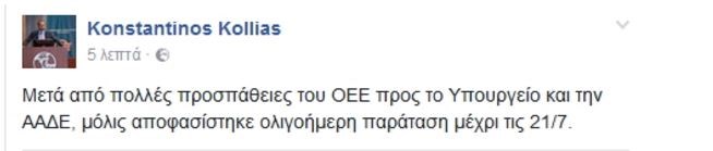 Παράταση αποφάσισε να δώσει το υπουργείο Οικονομικών για την υποβολή των φορολογικών δηλώσεων σύμφωνα με τον πρόεδρο του Οικονομικού Επιμελητηρίου Ελλάδος, Κωνσταντίνο Κόλλια.Με ανάρτησή του στο Facebook, ο κ. Κόλλιας αναφέρει χαρακτηριστικά ότι δόθηκε παράταση μέχρι την Παρασκευή 21 Ιουλίου.Σημειώνεται ότι η προθεσμία κανονικά ήταν μέχρι την ερχόμενη Δευτέρα 17 Ιουλίου.