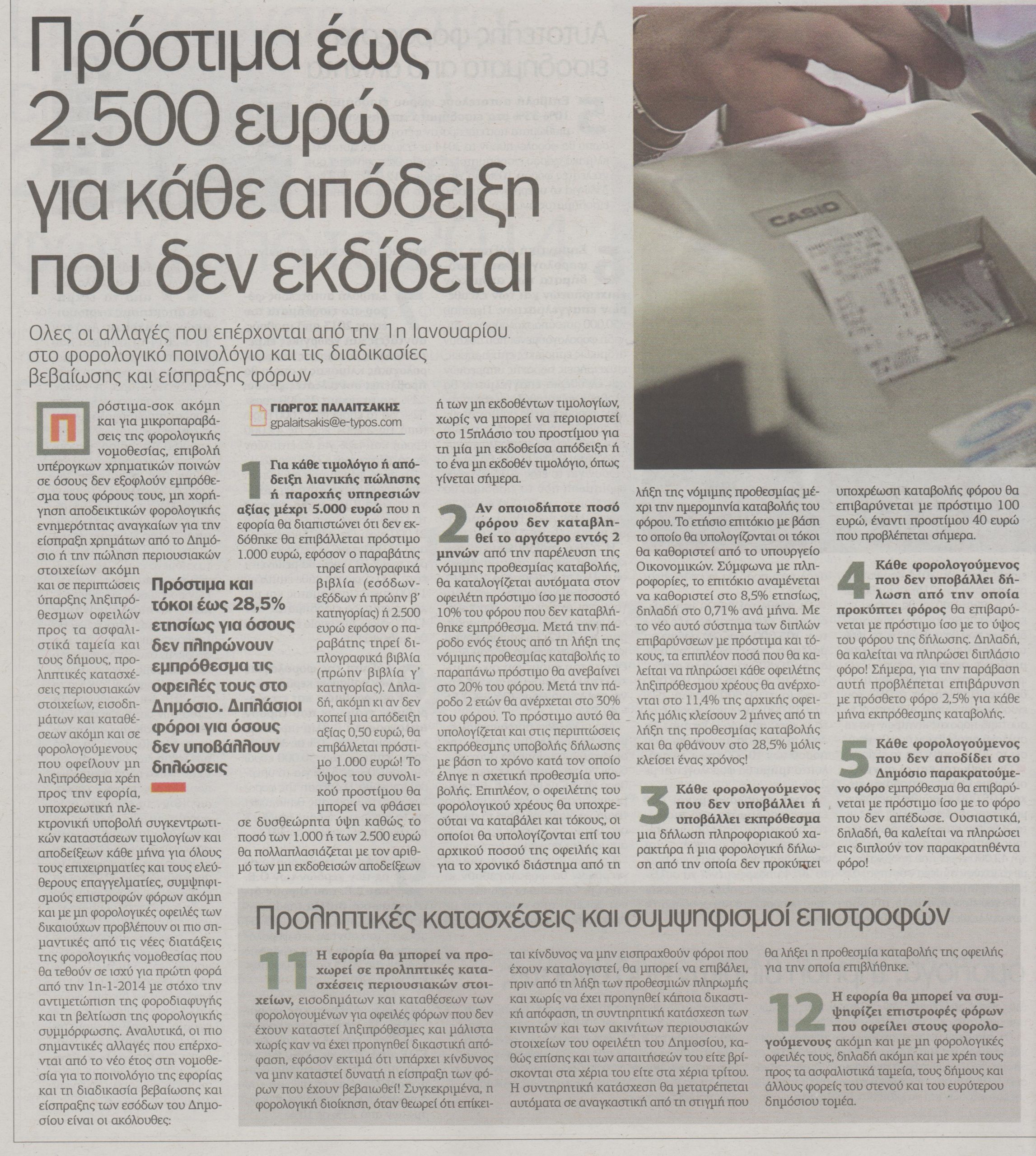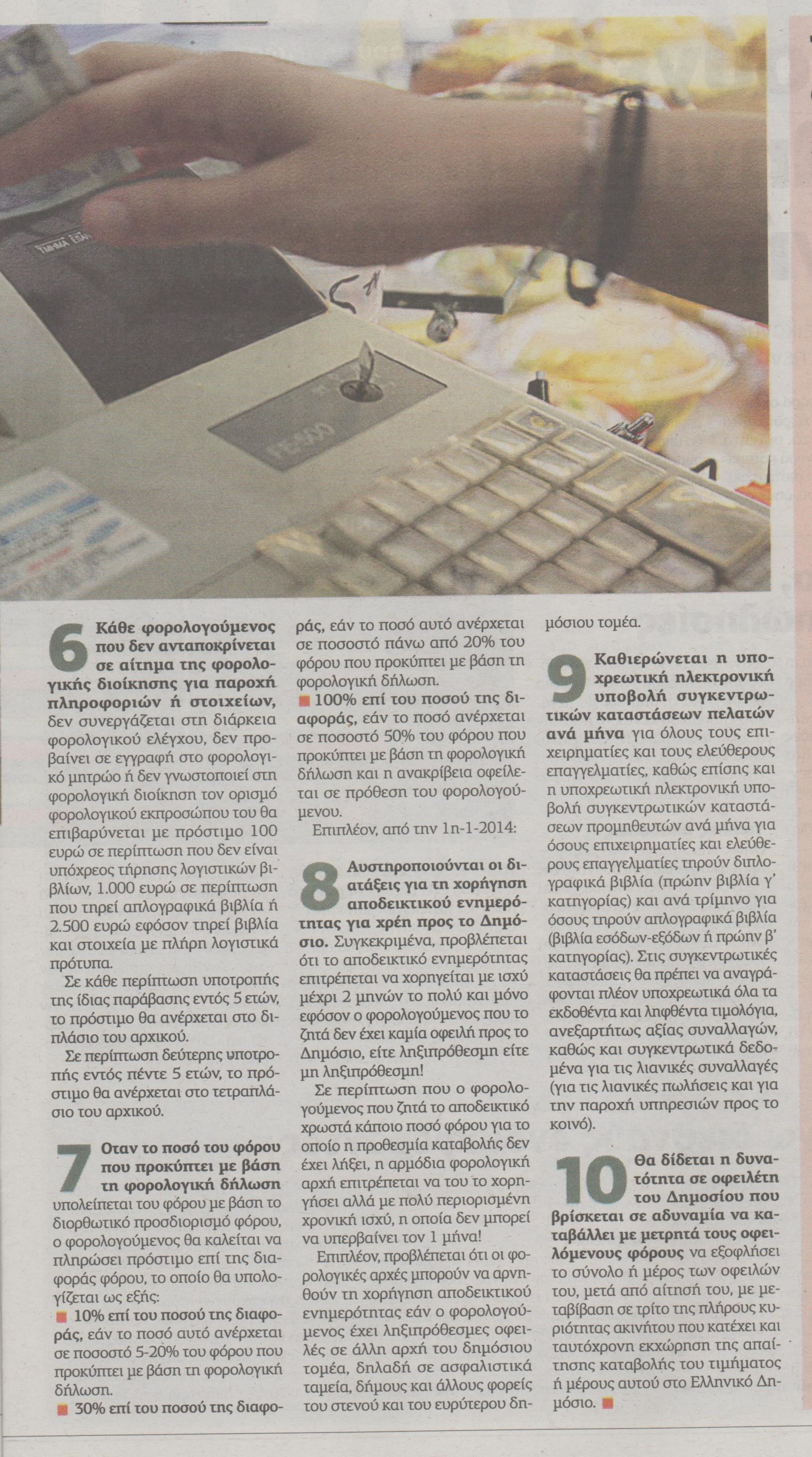 Πρόστιμα-σοκ ακόμη και για μικροπαραβάσεις της φορολογικής νομοθεσίας, επιβολή υπέρογκων χρηματικών ποινών σε όσους δεν εξοφλούν εμπρόθεσμα τους φόρους τους, μη χορήγηση αποδεικτικών φορολογικής ενημερότητας αναγκαίων για την είσπραξη χρημάτων από το δημόσιο ή την πώληση περιουσιακών στοιχείων ακόμη και σε περιπτώσεις ύπαρξης ληξιπρόθεσμων οφειλών προς τα ασφαλιστικά ταμεία και τους δήμους, προληπτικές κατασχέσεις περιουσιακών στοιχείων, εισοδημάτων και καταθέσεων ακόμη και σε φορολογούμενους που οφείλουν μη ληξιπρόθεσμα χρέη προς την εφορία, υποχρεωτική ηλεκτρονική υποβολή συγκεντρωτικών καταστάσεων τιμολογίων και αποδείξεων κάθε μήνα για όλους τους επιχειρηματίες και τους ελεύθερους επαγγελματίες, συμψηφισμούς επιστροφών φόρων ακόμη και με μη φορολογικές οφειλές των δικαιούχων προβλέπουν οι πιο σημαντικές από τις νέες διατάξεις της φορολογικής νομοθεσίας που θα τεθούν σε ισχύ για πρώτη φορά από την 1η-1-2014, με στόχο την αντιμετώπιση της φοροδιαφυγής και τη βελτίωση της φορολογικής συμμόρφωσης.