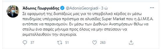 Συγκεκριμένα αναφέρει τα εξής: «Σε εφαρμογή της διατάξεώς για το υπερβολικό κέρδος εν μέσω πανδημίας υπέγραψα πρόστιμα σε αλυσίδες σούπερ μάρκετ που η Δ.Ι.Μ.Ε.Α. εντόπισε να παρανομούν. Εν μέσω των Διεθνών Ανατιμήσεων θέλω να στείλω ένα σαφές μήνυμα προς όλους να μην σπεύσουν να εκμεταλλευθούν την συγκυρία».