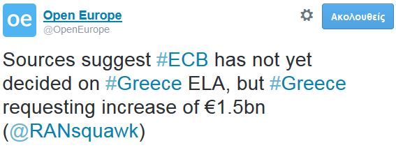 Η Ελλάδα ζητά από την ΕΚΤ αύξηση του ELA τουλάχιστον κατά 1,5 δισ. ευρώ στη σημερινή συνεδρίαση το μεσημέρι.