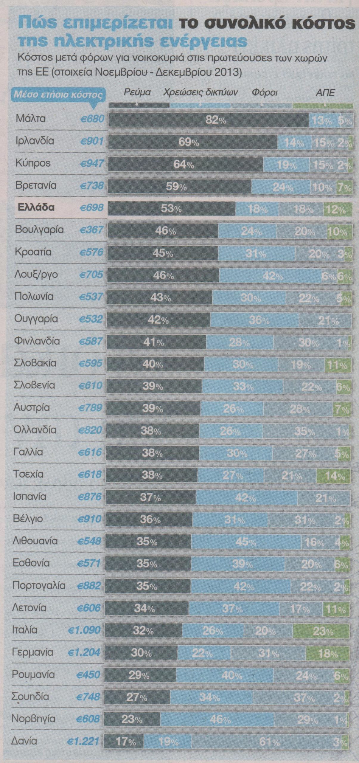 Σε απόλυτα νούμερα, πάντως, οι τιμές ηλεκτρικής ενέργειας στην Ελλάδα παραμένουν στον μέσο όρο της ΕΕ, με ακριβότερη χώρα τη Δανία. Ενδεικτικά, ένα νοικοκυριό με ετήσια κατανάλωση 4.000 κιλοβατώρες, πληρώνει 1.221 ευρώ στη Δανία, 1.204 ευρώ στη Γερμανία, 1.090 στην Ιταλία, 947 στην Κύπρο, 901 στην Ιρλανδία και 698 ευρώ στην Ελλάδα, η οποία μεταξύ των 28 καταλαμβάνει την 14η θέση.