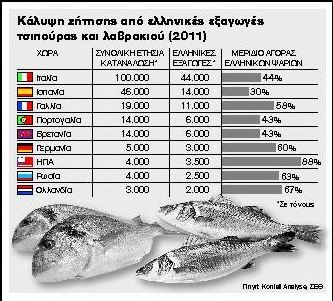 Μάλιστα από το σύνολο του πραγματοποιούμενου τζίρου το 50% αφορά τις εξαγωγές. Η χώρα μας κατέχει την πρώτη θέση στην παραγωγή ψαριών ιχθυοκαλλιέργειας στη Μεσόγειο.