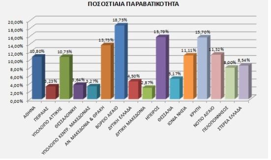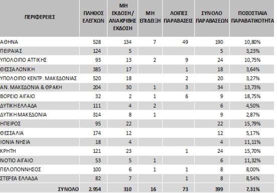 Από τους ελέγχους βεβαιώθηκαν πρόστιμα συνολικής αξίας 273.650 ευρώ. Οι περισσότερες παραβάσεις εντοπίστηκαν στην Αθήνα (190), ενώ η υψηλότερη παραβατικότητα εμφανίζεται στο Βόρειο Αιγαίο με 18,75% και ακολουθούν η Ήπειρος με 15,79% και η Κρήτη με 15,7%. Το μικρότερο ποσοστό παραβατικότητας εντοπίζεται στην περιφέρεια της Δυτικής Μακεδονίας με 2,8%.