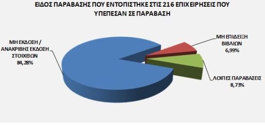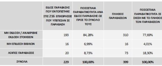 Αναλυτικότερα, σε 2.738 από τις ελεγχόμενες επιχειρήσεις δε διαπιστώθηκε καμία παράβαση. Ωστόσο, σε 216 επιχειρήσεις στις οποίες πραγματοποιήθηκε έλεγχος διαπιστώθηκαν συνολικά 399 παραβάσεις. Στη συντριπτική τους πλειοψηφία οι παραβάσεις αφορούν τη μη έκδοση αποδείξεων και στοιχείων.