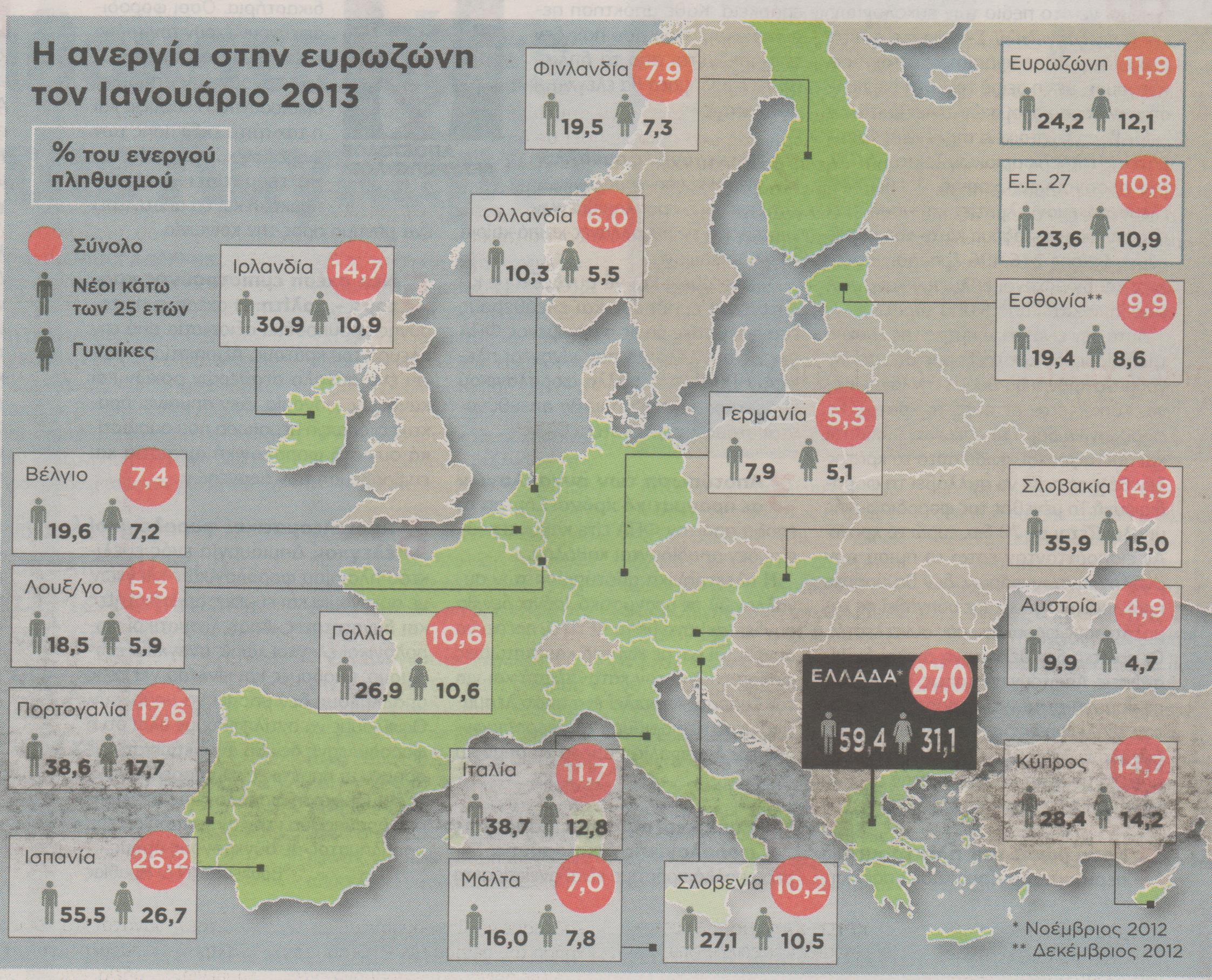 Η ανεργία συνεχίζει να αυξάνεται στην Ε.Ε. και την ευρωζώνη, ενώ η Ελλάδα έχει καταρρίψει κάθε προηγούμενο ρεκόρ σε ευρωπαϊκό επίπεδο, με την ανεργία να εκτινάσσεται στο 27% συνολικά και να πλησιάζει το 60% στους νέους κάτω των 25 ετών.