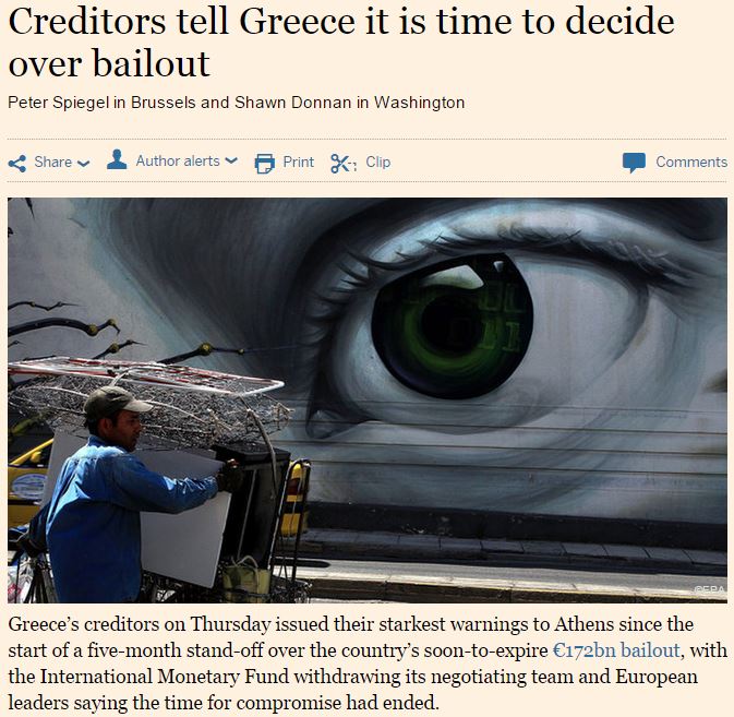 Με το Διεθνές Νομισματικό Ταμείο που αποσύρει την διαπραγματευτική του ομάδα και τους Ευρωπαίους ηγέτες να λένε ότι ο χρόνος για συμβιβασμό έχει λήξει ασχολείται το πρωτοσέλιδο των Financial Times.