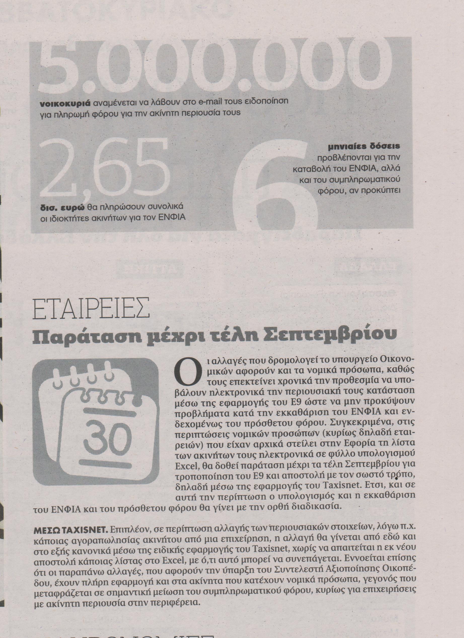Έτσι, εκατομμύρια φορολογούμενοι θα ενημερωθούν, μέσω e-mail, για τις οφειλές τους τόσο για τον ΕΝΦΙΑ όσο και για το συμπληρωματικό φόρο που επιβάλλεται σε ακίνητη περιουσία άνω των 300.000 ευρώ.