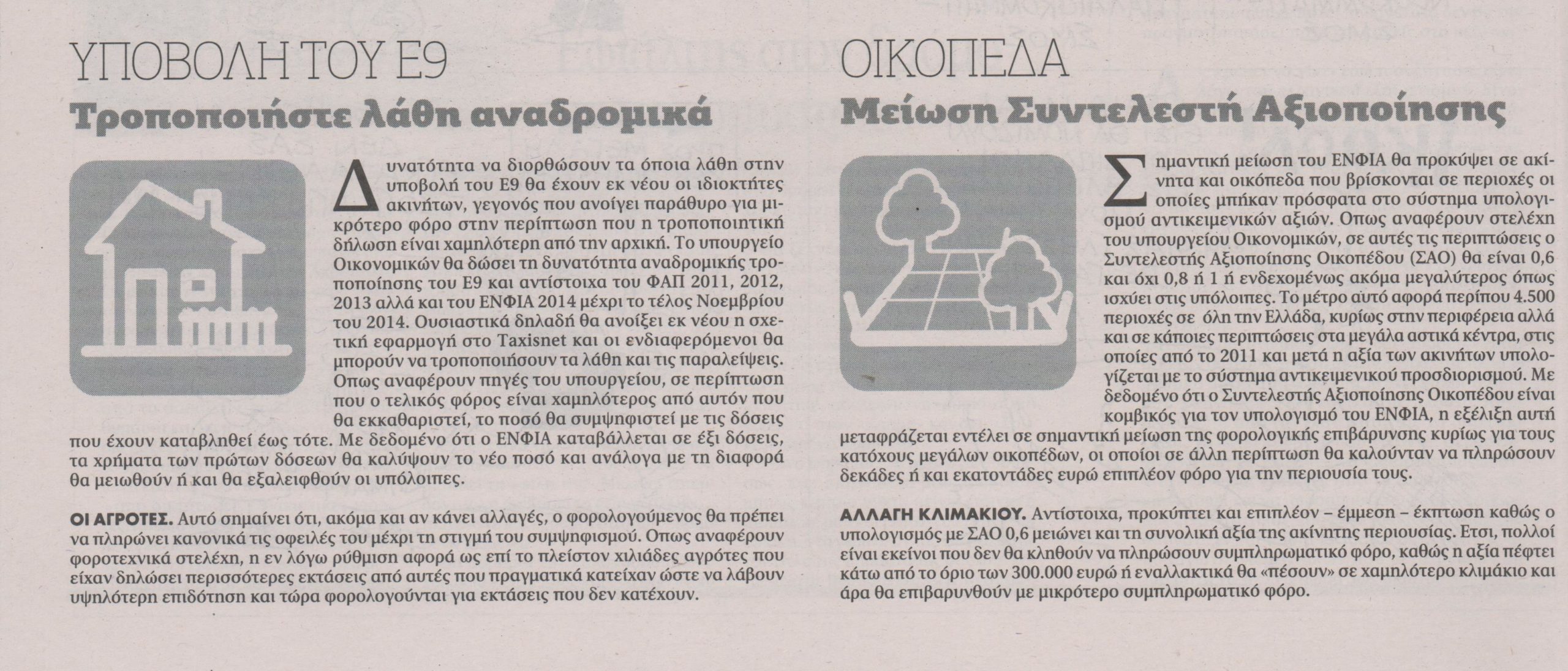 Πρόκειται για αλλαγές με τις οποίες ρυθμίζονται εκκρεμότητες που υπήρχαν στον υπολογισμό του φόρου και γίνεται εφικτή η εκκαθάριση του ΕΝΦΙΑ, κάτι που αναμένεται να ολοκληρωθεί έως τα τέλη του Ιουλίου.
