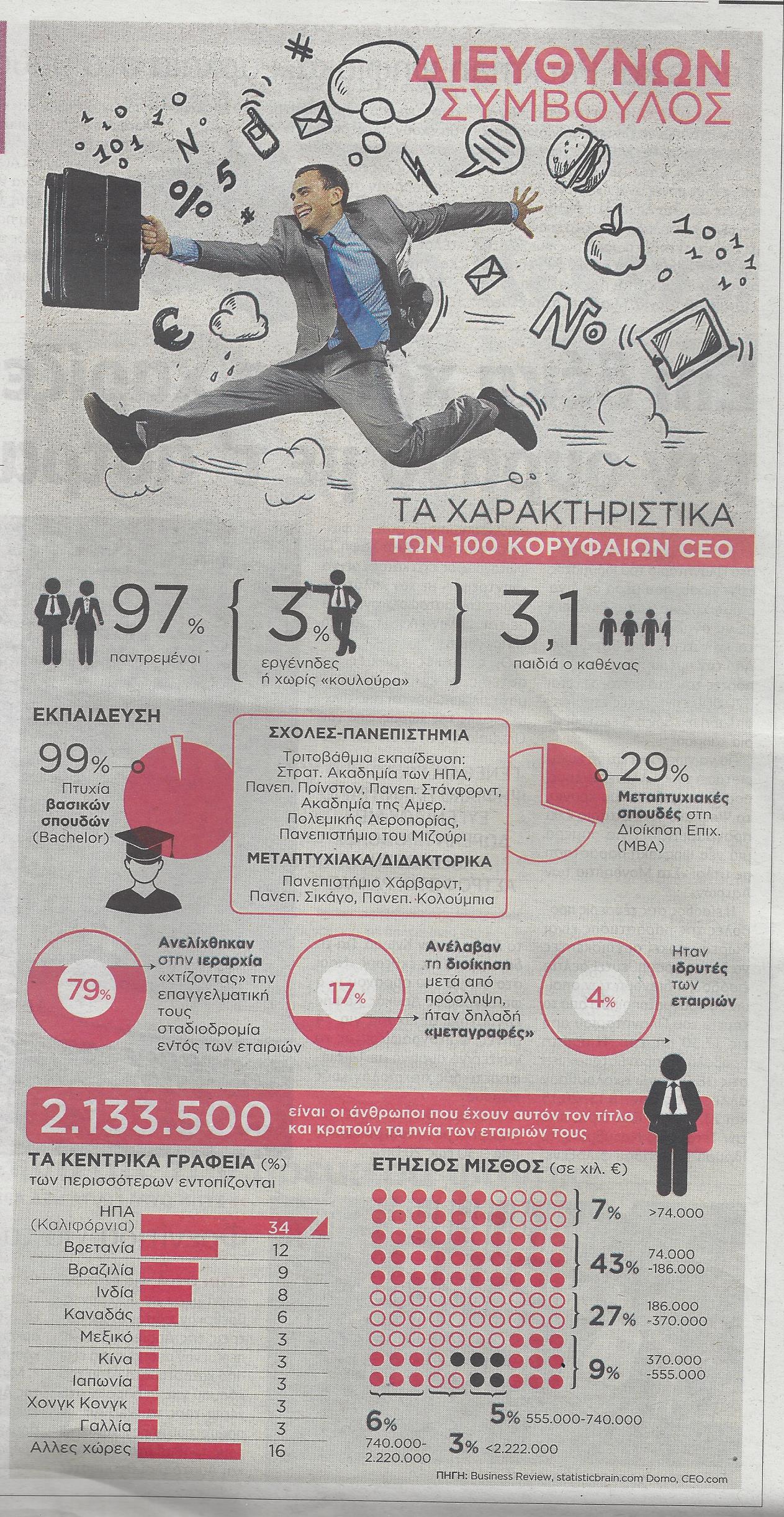 Αυτή είναι εν ολίγοις η…ανατομία των Ανώτατων Διευθυντικών Στελεχών (CEO) κορυφαίων εταιριών που επηρεάζουν σε καθημερινή βάση τους διεθνείς οικονομικούς δείκτες και διαμορφώνουν το αύριο της βιομηχανίας, της τεχνολογίας, της επιστήμης και της υγείας. Τα παραπάνω στοιχεία, ωστόσο, είναι ορισμένα μόνο από τα κοινά χαρακτηριστικά των 3.143 διευθυνόντων συμβούλων που εντόπισαν οι ειδικοί του ακαδημαϊκού περιοδικού «Harvard Business Review», της εταιρίας συμβουλευτικών υπηρεσιών Domo και της ιστοσελίδας CEO.com, στα πρόσωπα που καταρτίζουν τη λίστα των 100 κορυφαίων CEO των τελευταίων δεκαετιών.