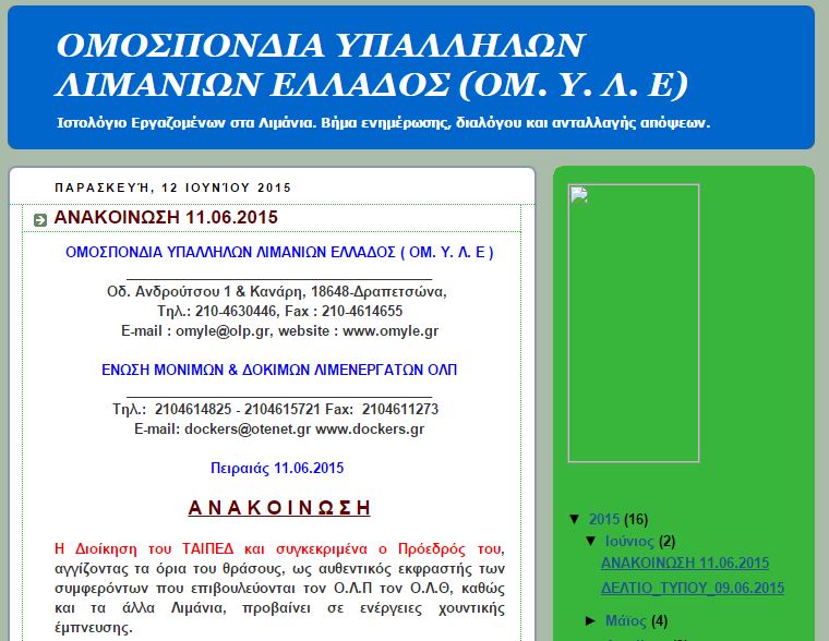 “Η Διοίκηση του ΤΑΙΠΕΔ και συγκεκριμένα ο Πρόεδρός του, αγγίζοντας τα όρια του θράσους, ως αυθεντικός εκφραστής των συμφερόντων που επιβουλεύονται τον Ο.Λ.Π τον Ο.Λ.Θ, καθώς και τα άλλα Λιμάνια, προβαίνει σε