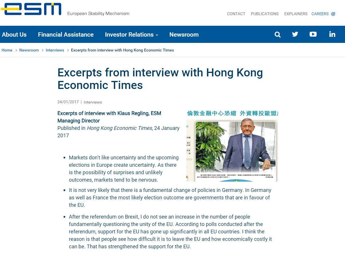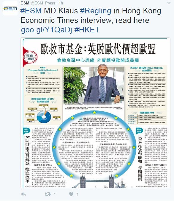 «H προσέγγισή μας για την Ελλάδα έχει αποτελέσματα», δήλωσε ο διευθύνων σύμβουλος του Ευρωπαϊκού Μηχανισμού Σταθερότητας, Κλάους Ρέγκλινγκ, σε συνέντευξη που έδωσε στην εφημερίδα Hong Kong Economic Times, αποσπάσματα της οποίας αναρτήθηκαν στο Twitter του ESM.