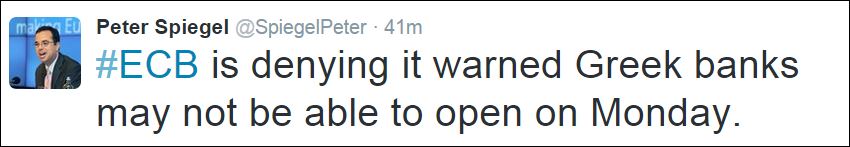 «Η ΕΚΤ αρνείται ότι προειδοποίησε για το ενδεχόμενο να μην ανοίξουν οι ελληνικές τράπεζες τη Δευτέρα», έγραψε ο Peter Spiegel.