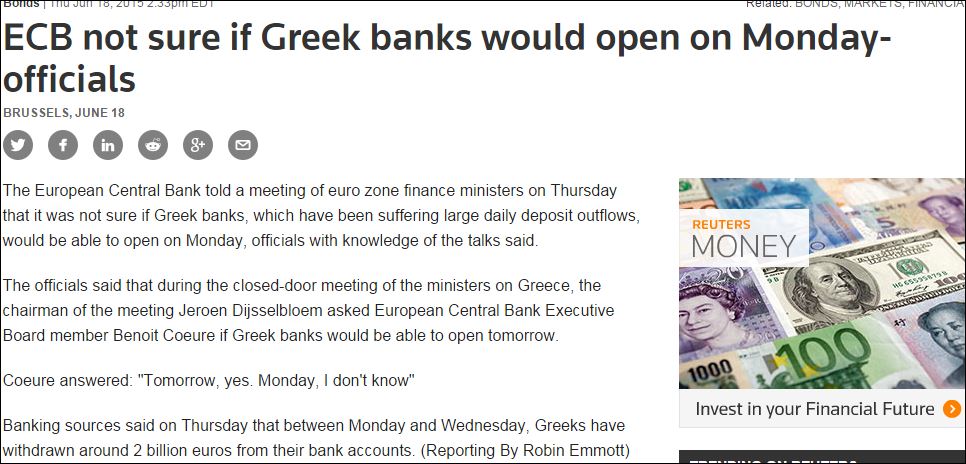 «Οι αξιωματούχοι είπαν ότι κατά τη διάρκεια της κεκλεισμένων των θυρών συνεδρίασης του Eurogroup για την Ελλάδα, ο επικεφαλής του συμβουλίου των υπουργών Οικονομικών της ευρωζώνης Γερούν Ντάισελμπλουμ ρώτησε το μέλος του διοικητικού συμβουλίου της ΕΚΤ Benoit Coeure για το εάν οι ελληνικές τράπεζες θα είναι σε θέση να ανοίξουν αύριο. Ο Coeure απάντησε: “Αύριο ναι. Δευτέρα, δεν ξέρω”.