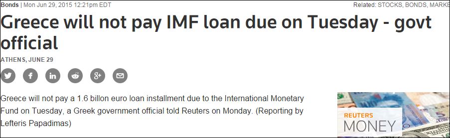 «Η Ελλάδα δεν θα πληρώσει τη δόση ύψους 1,6 δισ. ευρώ προς το Διεθνές Νομισματικό Ταμείο την Τρίτη», αναφέρει το Reuters επικαλούμενο Έλληνα αξιωματούχο.