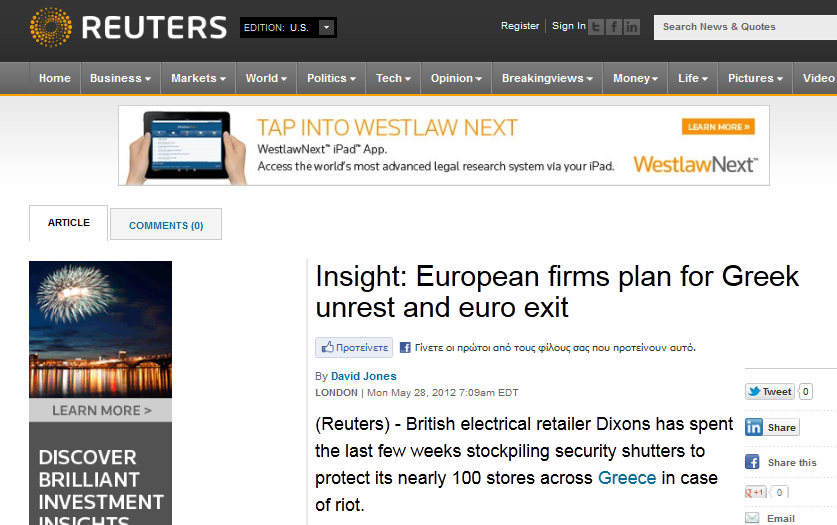 “Οι ευρωπαϊκές εταιρείες προετοιμάζονται για την ελληνική έξοδο και αναταραχή”, αναφέρει σε δημοσίευμά του το Reuters. Η βρετανική εταιρεία ηλεκτρικών ειδών Dixons τις τελευταίες εβδομάδες προετοιμάζεται για την προστασία των περίπου 100 καταστημάτων της σε όλη την Ελλάδα σε περίπτωση αναταραχών, σημειώνει το δημοσίευμα.