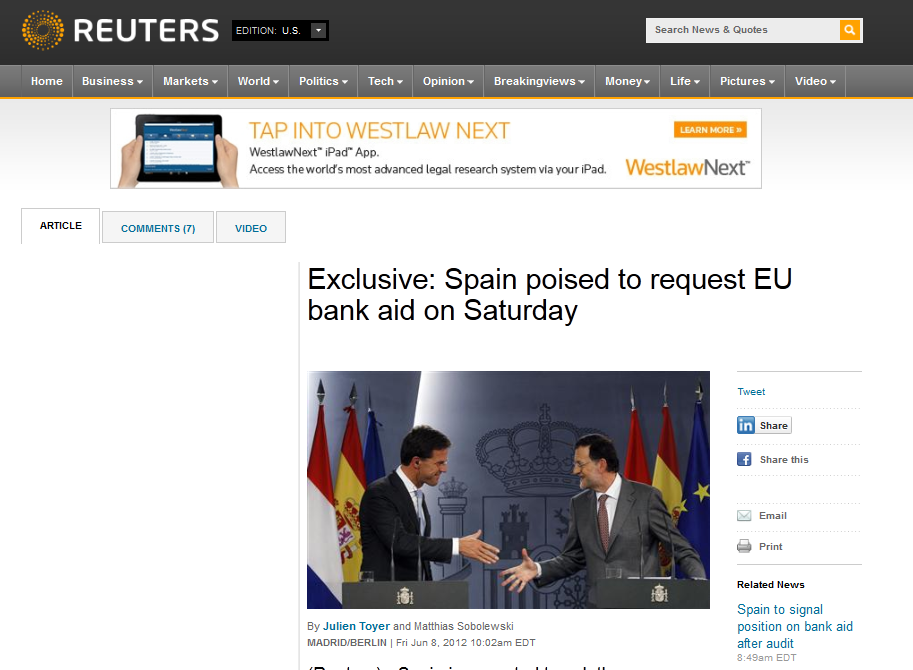 Χρηματοδότηση από την Ε.Ε. για την ανακεφαλαιοποίηση των τραπεζών της, θα ζητήσει μέσα στο Σαββατοκύριακο η Ισπανία, σύμφωνα με αποκλειστικές πληροφορίες του Reuters επικαλούμενο πηγές από το Βερολίνο και τις Βρυξέλλες.Αν γίνει αυτό, η Ισπανία θα είναι η τέταρτη χώρα που ζητά βοήθεια από τότε που άρχισε η κρίση στην ευρωζώνη.