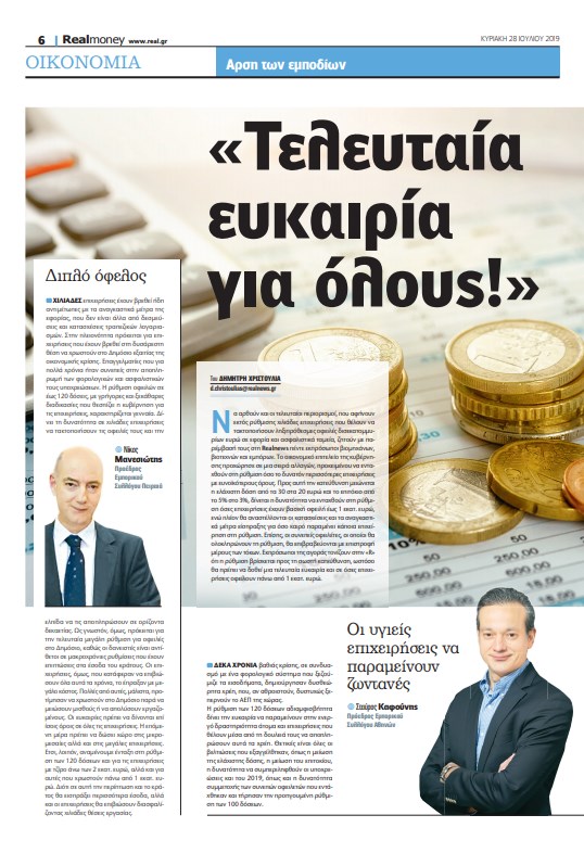 Να αρθούν και οι τελευταίοι περιορισμοί, που αφήνουν εκτός ρύθμισης χιλιάδες επιχειρήσεις που θέλουν να τακτοποιήσουν ληξιπρόθεσμες οφειλές δισεκατομμυρίων ευρώ σε εφορία και ασφαλιστικά ταμεία, ζητούν με παρέμβασή τους στη Realnews πέντε εκπρόσωποι βιομηχάνων, βιοτεχνών και εμπόρων.Διαβάστε εδώ το δημοσίευμα της Realnews
