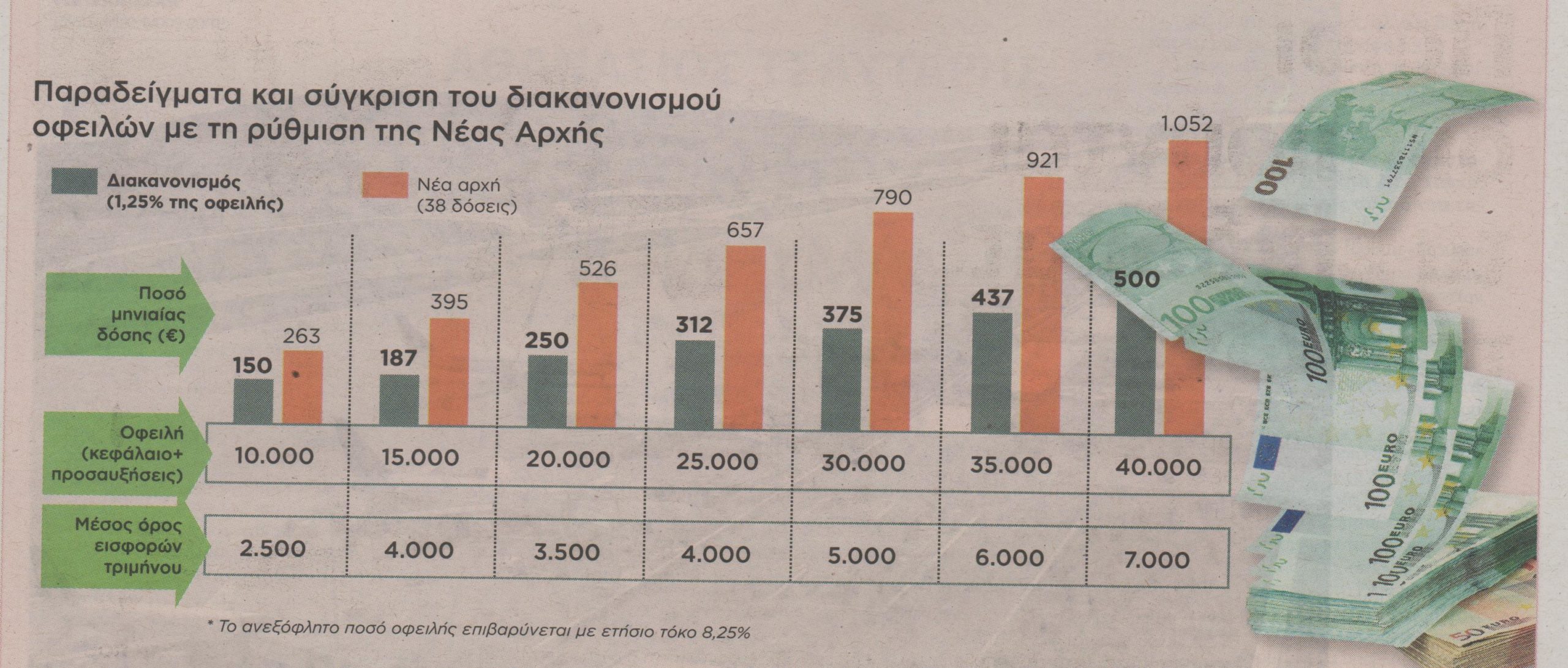 Το ποσό αυτό είναι πολλαπλάσιο σε σύγκριση με τα προσδοκώμενα έσοδα για το 2014 από τη ρύθμιση της νέας αρχής καθώς με βάση τον έως τώρα αριθμό των οφειλετών που έχουν ενταχθεί στη «νέα αρχή» το μεν ΙΚΑ προσδοκά ότι θα πάρει 111 εκατ. ευρώ και ο ΟΑΕΕ μόλις 37 εκατ. ευρώ για το 2014.