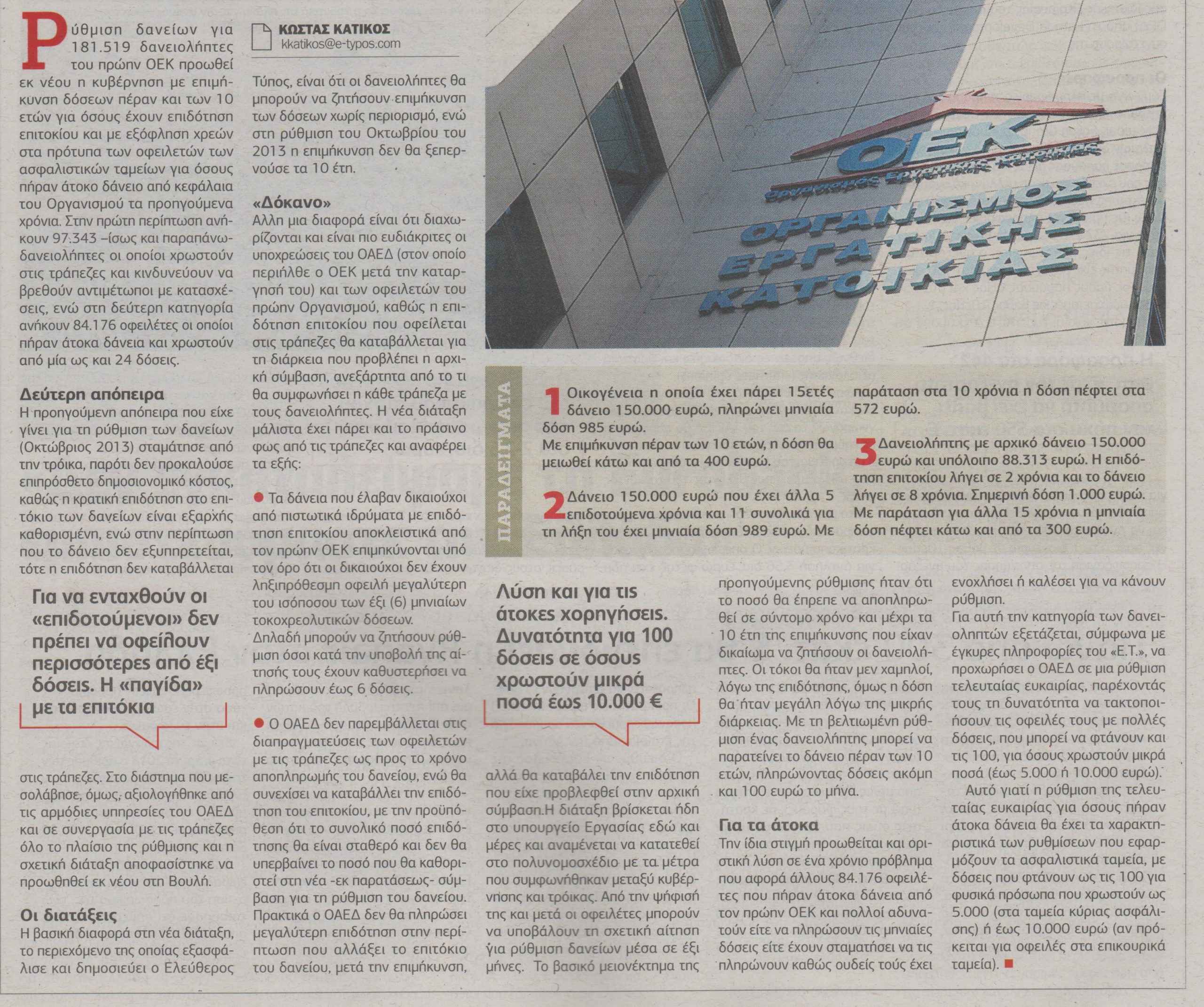 Ρύθμιση δανείων για 181.519 δανειολήπτες του πρώην ΟΕΚ προωθεί εκ νέου η κυβέρνηση με επιμήκυνση δόσεων πέραν και των 10 ετών για όσους έχουν επιδότηση επιτοκίου και με εξόφληση χρεών στα πρότυπα των οφειλετών των ασφαλιστικών ταμείων για όσους πήραν άτοκο δάνειο από κεφάλαια του Οργανισμού τα προηγούμενα χρόνια.