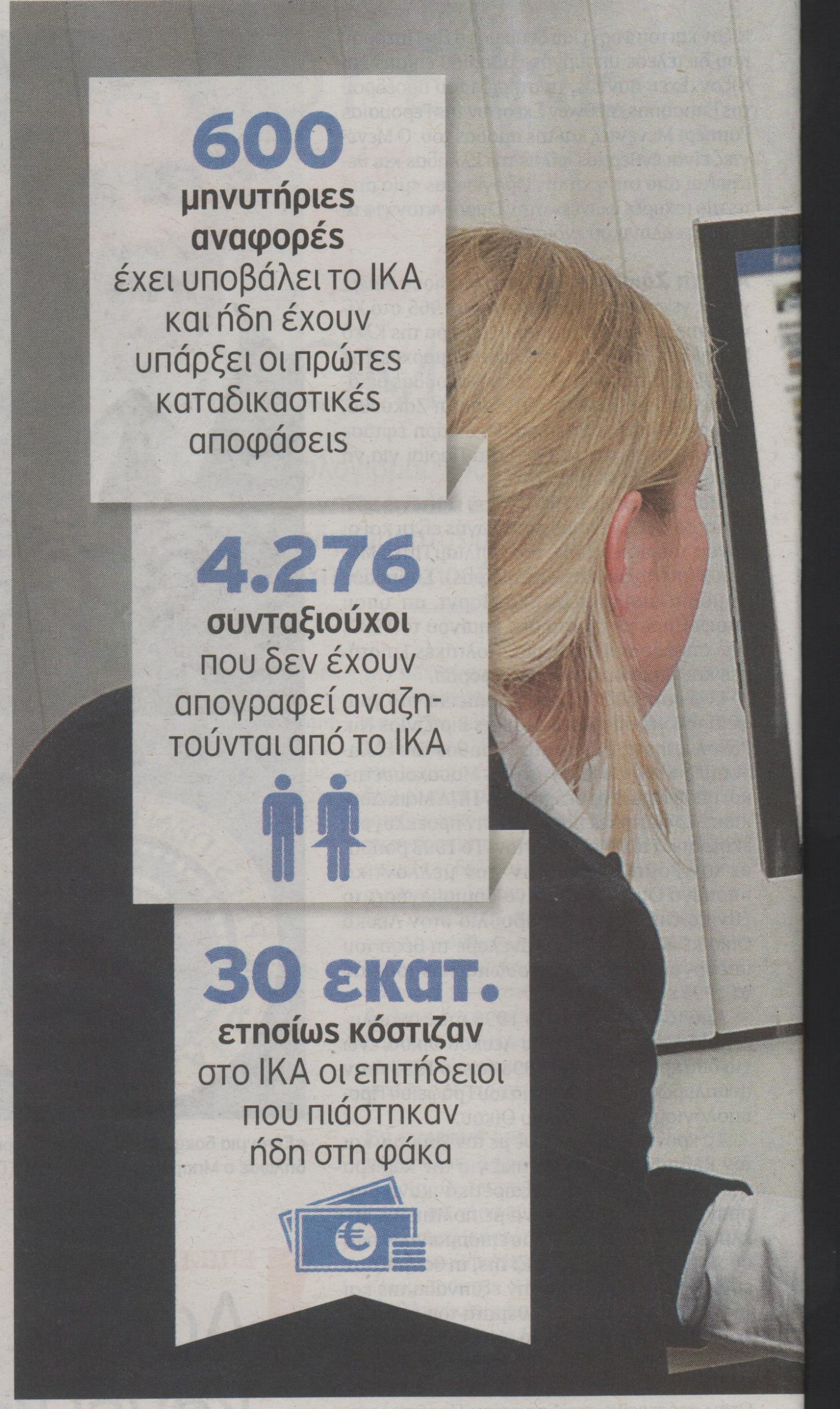 Ακόμα και μέσω… facebook τα ασφαλιστικά ταμεία αναζητούν τους επιτήδειους που εισπράττουν τις συντάξεις νεκρών συγγενών τους. «Συνήθεις ύποπτοι» είναι τα παιδιά, τα ανίψια αλλά και τα αδέλφια των συνταξιούχων, που συνεχίζουν να ροκανίζουν τους τραπεζικούς λογαριασμούς.