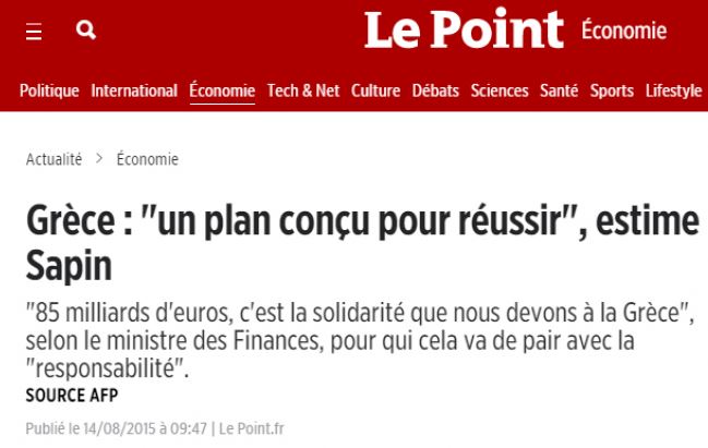 “Το σχέδιο αυτό δημιουργήθηκε για να επιτύχει”, δήλωσε ο Σαπέν στον ραδιοσταθμό France Inter σχετικά με την υιοθέτηση σήμερα από το ελληνικό κοινοβούλιο του τρίτου σχεδίου βοήθειας για την Ελλάδα ύψους 85 δισεκατομμυρίων ευρών.
