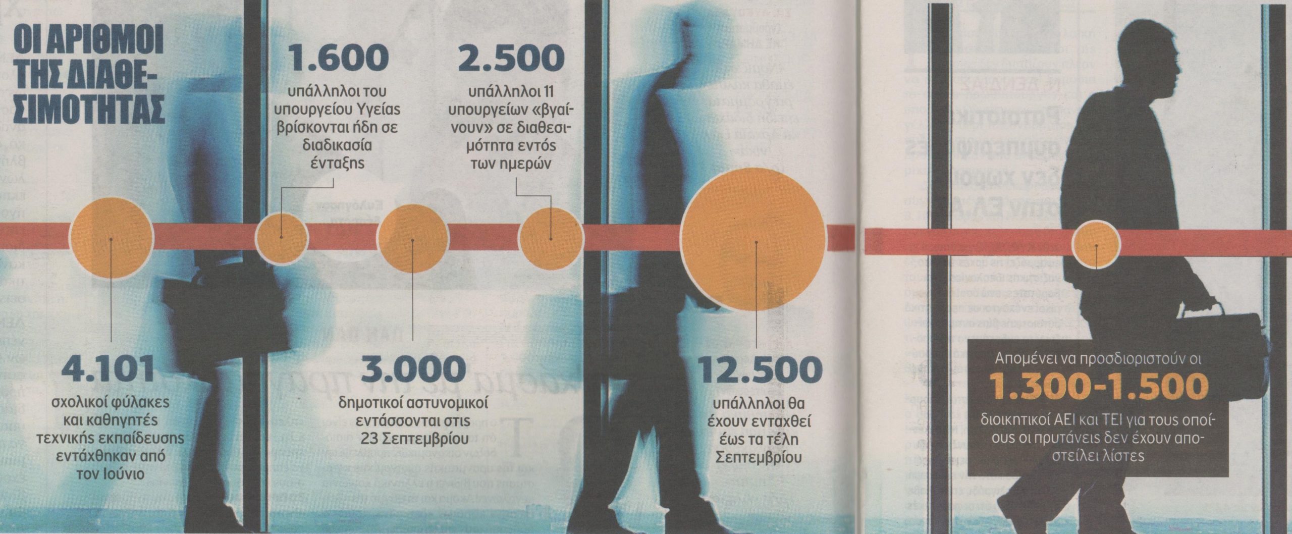 Σύμφωνα με πληροφορίες, μέχρι αύριο οπότε έχει προγραμματιστεί συνεδρίαση του Κυβερνητικού Συμβουλίου Διοικητικής Μεταρρύθμισης, θα έχουν υπογραφεί κοινές υπουργικές αποφάσεις για την κατάργηση συνολικά 2.300-2.500 οργανικών θέσεων από 11 υπουργεία, προκειμένου να επιτευχθεί ο στόχος των 12.500 διαθεσιμοτήτων μέχρι τα τέλη του μηνός.