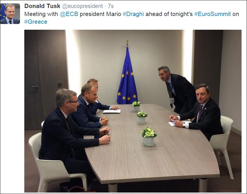 Σε εξέλιξη βρίσκεται η συνάντηση του Προέδρου του Ευρωπαϊκού Συμβουλίου, Ντόναλντ Τουσκ με τον Πρόεδρο της Ευρωπαϊκής Κεντρικής Τράπεζας, Μάριο Ντράγκι για την Ελλάδα.