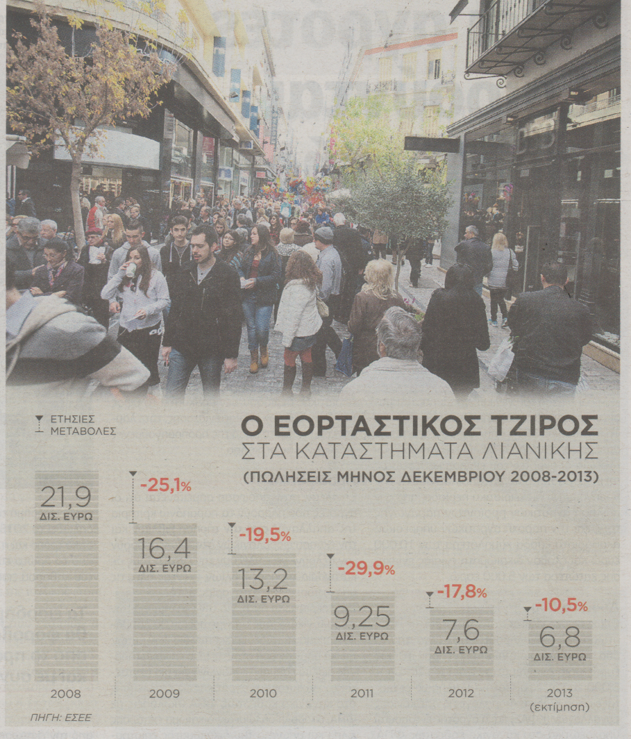 Σύμφωνα με τις εκτιμήσεις της Εθνικής Συνομοσπονδίας Ελληνικού Εμπορίου, ο εορταστικός τζίρος ήταν μειωμένος κατά 800εκ. ευρώ σε σχέση με τον προηγούμενο χρόνο( 7,6 δισεκατομμύρια ευρώ ο τζίρος του 2012), ενώ αν γίνει σύγκριση με τα έτη από το 2008 και μετά, οι πωλήσεις έχουν υποστεί καθίζηση: ο εορταστικός τζίρος το 2008 ήταν 21,9 δισεκατομμύρια ευρώ, ενώ τον Δεκέμβριο του 2013( κυρίως στο δεύτερο δεκαπενθήμερο) ήταν μόλις… 6,8 δισεκατομμύρια ευρώ. Σημειώνεται ότι η χριστουγεννιάτικη αγορά καλύπτει το 25% του ετήσιου τζίρου.