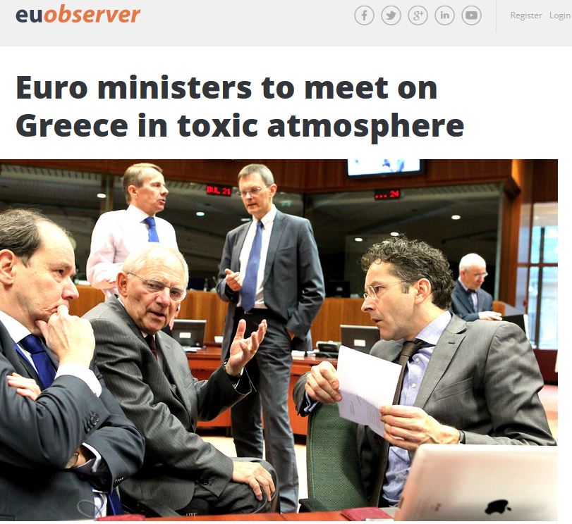 Σε τοξική ατμόσφαιρα αναμένεται να γίνει στο Eurogroup η συνάντηση για την ελληνική διάσωση όπου θα μπορούσε κάποιος να δει τη Γερμανία να πιέζει για αυστηρότερους όρους, αναφέρει το στο Euobserver, καθώς βρίσκεται σε σύγκρουση με το Διεθνές Νομισματικό Ταμείο (ΔΝΤ) σχετικά με την ελάφρυνση του χρέους.