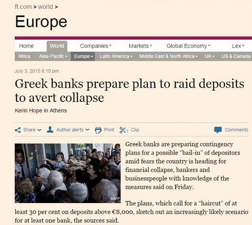 Σημειώνει ότι ο χρόνος μετρά αντίστροφα για τις τράπεζες στην Ελλάδα, παρά τις διαβεβαιώσεις για το αντίθετο του επικεφαλής τη ΕΚΤ Μάριο Ντράγκι αναφορικά με το bail-in. Μια ημέρα πριν το δημοψήφισμα η ίδια εφημερίδα διέδιδε σενάρια για “κούρεμα 30% στις καταθέσεις άνω των 8.000 ευρώ” και πως οι ελληνικές τράπεζες προετοιμάζουν σχέδια έκτακτης ανάγκης για ένα πιθανό “bail-in”.