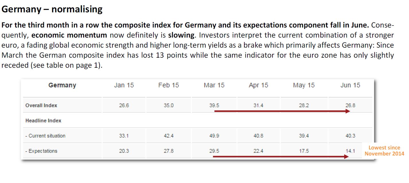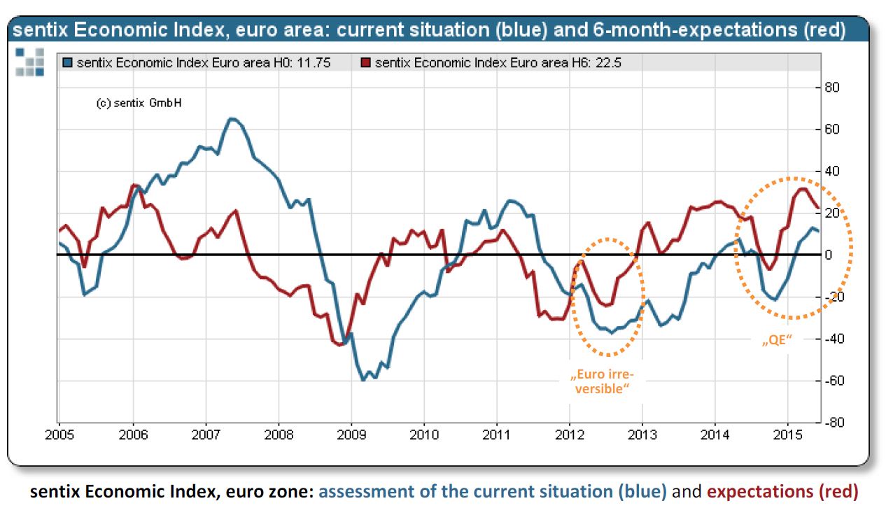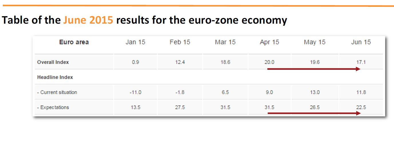«Δεν προκαλεί ιδιαίτερη εντύπωση ότι το οικονομικό βαρόμετρο παρουσιάζει μια πιο θολή εικόνα δεδομένου ότι παραμένει άλυτο το θέμα του μέλλοντος της Ελλάδας, το ενιαίο νόμισμα ενισχύθηκε και πάλι, ενώ και τα μακροπρόθεσμα επιτόκια επίσης αυξήθηκαν πρόσφατα», σχολίασε ο Σεμπάστιαν Βάνκε, αναλυτής στη Sentix.