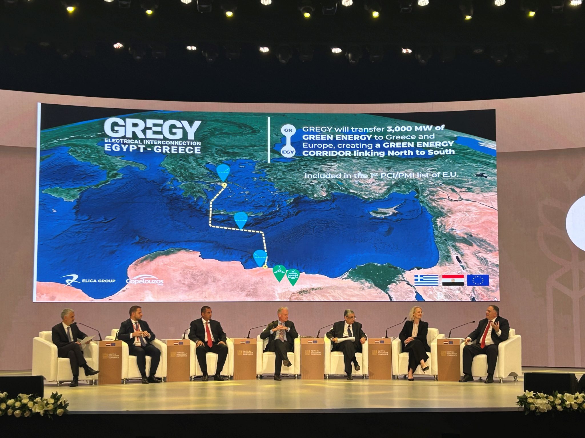 Επίσης, ο Διευθύνων Σύμβουλος της Επιχειρησιακής Μονάδας Ανανεώσιμων Πηγών και Αποθήκευσης Ενέργειας του Ομίλου Κοπελούζου & Διευθύνων Σύμβουλος της ELICA, που αναπτύσσει το έργο της ηλεκτρικής διασύνδεσης Αιγύπτου-Ελλάδος «GREGY», κ. Ιωάννης Καρύδας, προσκλήθηκε στη συζήτηση με θέμα τις Ανανεώσιμες Πηγές Ενέργειας, παρουσίασε το «GREGY» και ανέδειξε τη σημασία του, όχι μόνο για την Αίγυπτο και την Ελλάδα, αλλά και για την Ευρώπη στην προσπάθεια απανθρακοποίησης της, της επίτευξης μηδενικών ρύπων και ενεργειακής ασφάλειας. Ο κ. Καρύδας υπογράμμισε, επίσης, την ευθυγράμμιση του έργου με τη στρατηγική της Ευρωπαϊκής Ένωσης για ταχύτερη μετάβαση στην πράσινη ενέργεια.