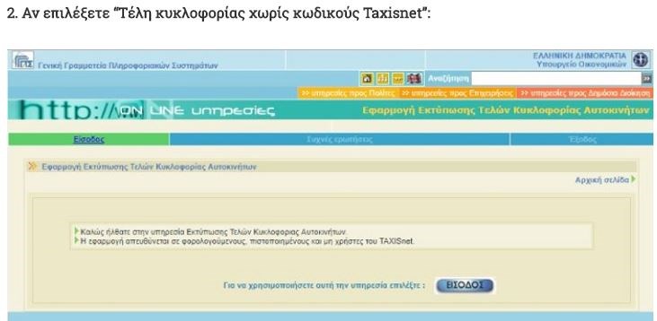 Οι ιδιοκτήτες οχημάτων για να εκτυπώσουν το ειδοποιητήριο στο οποίο αναγράφεται ο κωδικός για την πληρωμή των τελών θα πρέπει να εισέλθουν στην ειδική ηλεκτρονική εφαρμογή του Taxisnet, όταν αυτή θα είναι διαθέσιμη, και να ακολουθήσουν τα εξής βήματα: