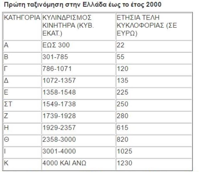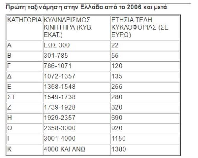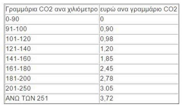 Επιβατικά αυτοκίνητα ταξινομούμενα για πρώτη φορά την Ελλάδα από 1.11.2010 και μετά, αποκλειστικά με βάση τις εκπομπές διοξειδίου του άνθρακα (γραμμάρια C02 ανά χιλιόμετρο). Λαμβάνονται υπόψιν οι εκπομπές διοξειδίου του άνθρακα όπως αυτές αναγράφονται στην άδεια του οχήματος ως εξής: