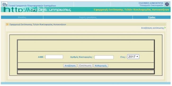 Αφού κλικάρετε την “ΕΙΔΟΔΟ”, θα μεταφερθείτε στην ηλεκτρονική φόρμα όπου μπορείτε να αναγράψετε το ΑΦΜ και τον αριθμό κυκλοφορίας και επιλέγοντας “ΑΝΑΖΗΤΗΣΗ” να βρείτε τα τέλη για το όχημα σας.