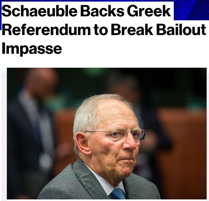 Σύμφωνα με το Bloomberg, η στάση του Σόιμπλε σε ένα ελληνικό δημοψήφισμα αποτελεί μία απόκλιση από τη θέση της Γερμανίας το 2011. Τότε, ο πρωθυπουργός Γιώργος Παπανδρέου εγκατέλειψε το σχέδιό του για ένα δημοψήφισμα αφού η Γερμανίδα καγκελάριος Άγκελα Μέρκελ και ο Γάλλος πρόεδρος Νικολά Σαρκοζί τον κάλεσαν να μην το πραγματοποιήσει.