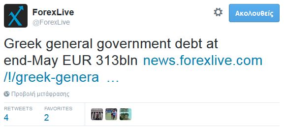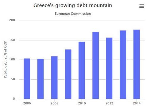 Το ελληνικό χρέος διαμορφώθηκε το Μάιο του 2015 στα 313 δισ. ευρώ (κοντά στο 180% του ΑΕΠ), όταν το Μάρτιο του 2010 πριν τη προσφυγή στα μνημόνια είχε διαμορφωθεί σε 310,3 δισ. ευρώ, σύμφωνα με το Δελτίο Δημοσίου Χρέους.