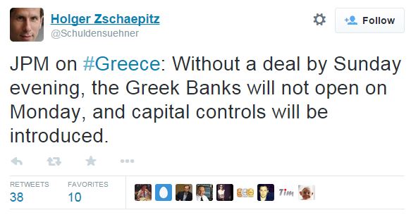 Έχουν αρχίσει ήδη τα… όργανα από ορισμένες επενδυτικές τράπεζες του εξωτερικού που διαδίδουν εκτιμήσεις πως εάν δεν υπάρξει συμφωνία το Σαββατοκύριακο δεν θα ανοίξουν οι τράπεζες τη Δευτέρα και θα επιβληθούν έλεγχοι κεφαλαίων.