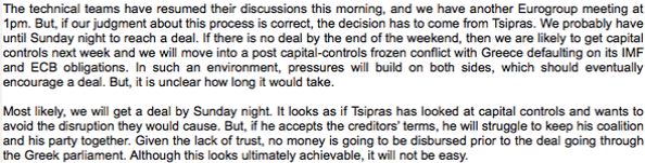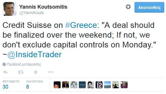 Όπως αναφέρουν σε tweet διεθνείς αναλυτές και σχολιαστές στις αγορές χρήματος και κεφαλαίου, μια ακόμη ανάλυση αυτή τη φορά της Credit Suisse κάνει το ίδιο: «Ένα deal πρέπει να ολοκληρωθεί στο Σαββατοκύριακο, αλλιώς δεν αποκλείουμε επιβολή ελέγχων κεφαλαίων στις τραπεζικές αναλήψεις από Δευτέρα», αναφέρει.