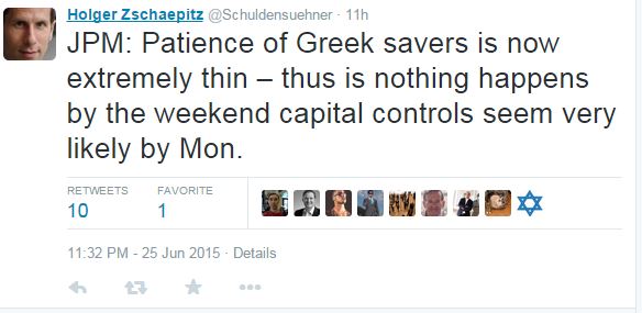 Αυτή την εκτίμηση μεταφέρει ο οικονομολόγος της JP Morgan, Ντέιβιντ Μακί, ο οποίος υποστηρίζει ότι η Κυριακή είναι πλέον η τελευταία κρίσιμη προθεσμία για την Αθήνα και παράλληλα εκφράζει… φόβους ότι εάν δεν επιτευχθεί συμφωνία, δεν αποκλείεται να επιβληθούν έλεγχοι κεφαλαίων στα ΑΤΜ.