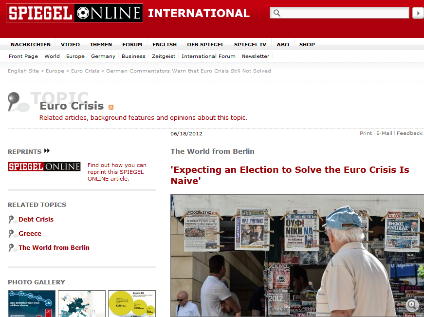 “Το να περιμένει κανείς, ότι με μία εκλογική αναμέτρηση θα σωθεί η Ευρώπη, είναι ανόητο” είναι ο τίτλος δημοσιεύματος της αγγλικής έκδοσης του περιοδικού Spiegel, στο οποίο αναφέρεται ότι “ναι μεν με τη νίκη της Ν.Δ. απετράπη προς το παρόν η έξοδος της Ελλάδας από την ευρωζώνη, ωστόσο ο χρόνος που έχει απομείνει προκειμένου να σωθεί η χώρα είναι αμφίβολο ότι επαρκεί, για να αντιμετωπιστούν τα προβλήματα”.”Είναι σαφές ότι ολόκληρη η Ευρώπη αναστέναξε από ανακούφιση, όταν έγινε γνωστό το αποτέλεσμα των ελληνικών εκλογών, καθώς η Ν.Δ. είναι διατεθειμένη να τηρήσει τις δεσμεύσεις της, απέναντι στην Ε.Ε. και το ΔΝΤ. Οι περισσότεροι Ευρωπαίοι ηγέτες χαιρέτισαν τη νίκη της Ν.Δ. και επανέλαβαν τη στήριξή τους προς την Ελλάδα -με προϋπόθεση φυσικά την εφαρμογή του προγράμματος λιτότητας” αναφέρει το δημοσίευμα.