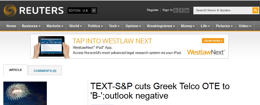 Για τον ΟΤΕ, η μακροπρόθεσμη πιστοληπτική αξιολόγηση υποβαθμίστηκε σε σε “Β- από “Β” προχώρησε την Πέμπτη ο οίκος αξιολόγησης Standard & Poor’s, δίνοντας επίσης αρνητικές προοπτικές στην εταιρεία.